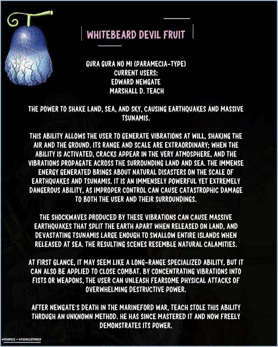Orada basit bir şekilde WB çok güçlü ve dünyayı yıkabilecek bir yeteneği var bundan dolayı roger yaşarken bile en güçlü ünvanı ondaydı denmiş sen ise adamın hem gücünü hem yeteneğini direkt meyveye veriyorsun, ajandana girecek ya sonra da gelip meyveden dolayı diyorsun.