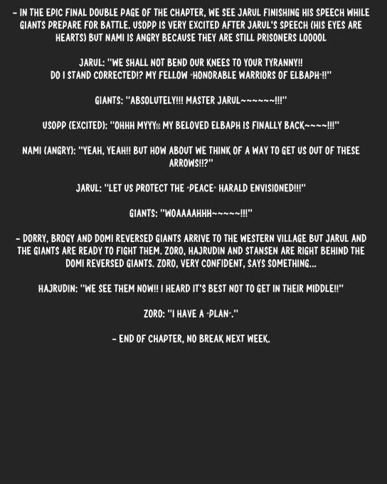 - Jinbe, Nami, Robin ve Usopp halen Gunko'nun oklarıyla bağlı haldeymiş. Jinbe, Brook'un "bir şey fark etmiş" gibi göründüğünü ve gittiğini söylemiş (Brook bu panelde onlarla birlikte görünmüyormuş).