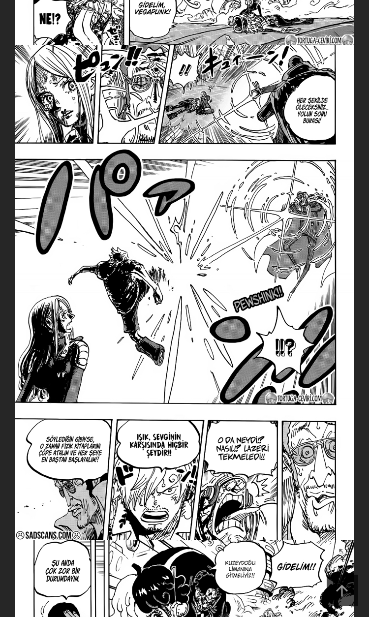 Sana o panelin öncesini sonrasını attım Sanji orada yoktu yukarıdan aşağıya düşenlere Kizaru saldırı yapıyor ve Sanji koşup ayağını uzatıyor dikkat edersen adam topa müdahale yapar gibi havada bacağını uzatıyor ve lazeri ayağıyla engelliyor.He gövdesinde bir karartı var ama belli değil çünkü lazer delip geçtiğinde Kuma gibi ışık olarak girip ışık olarak çıkıyor herkesten aynı çıkıyor Sanjide mi farklı?